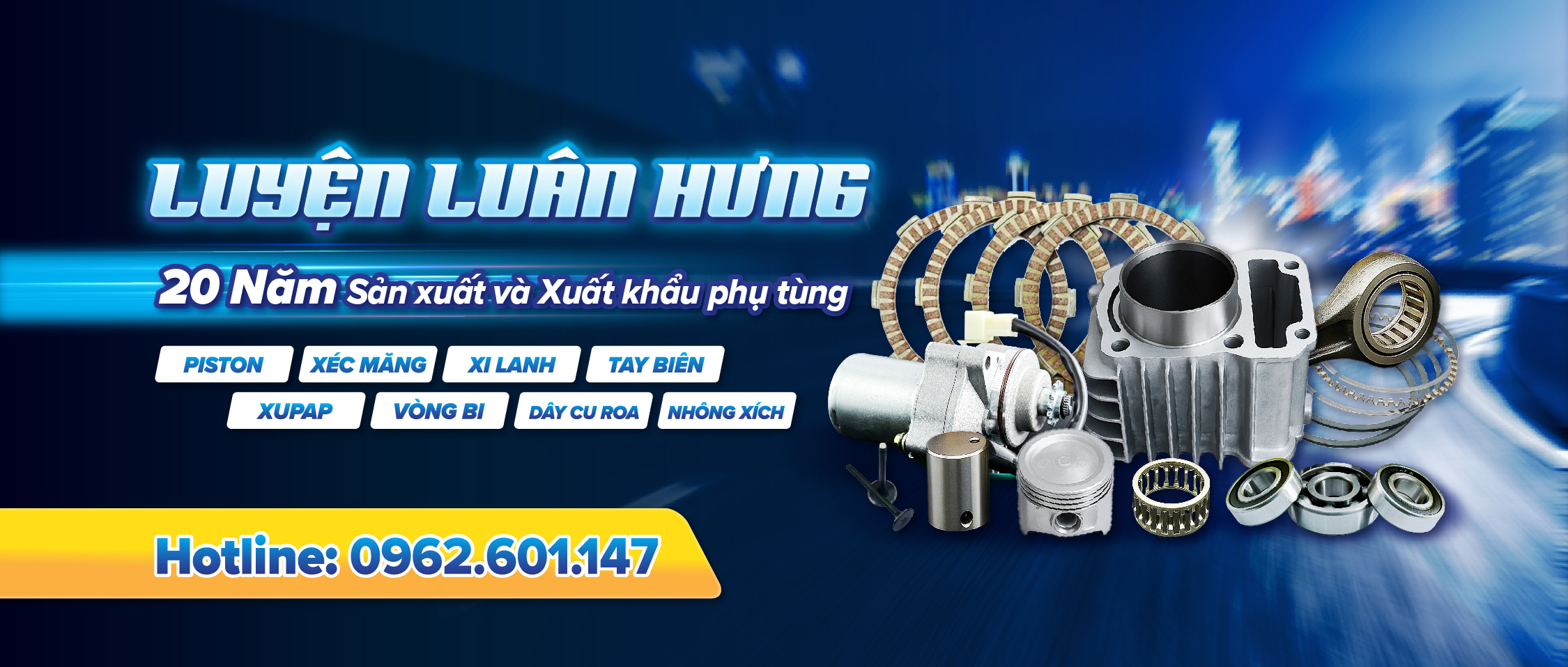 Công ty TNHH Luyện Luân Hưng với hơn 30 năm kinh nghiệm tại Đài Loan và 20 năm tại Việt Nam, chuyên sản xuất piston, xéc-măng và phụ tùng xe máy. Chúng tôi là đối tác của SYM, xuất khẩu sang nhiều quốc gia, đồng thời cung cấp dịch vụ OEM và phân phối các linh kiện như xi lanh, tay biên, vòng bi, xupap, dây curoa, nhông xích…