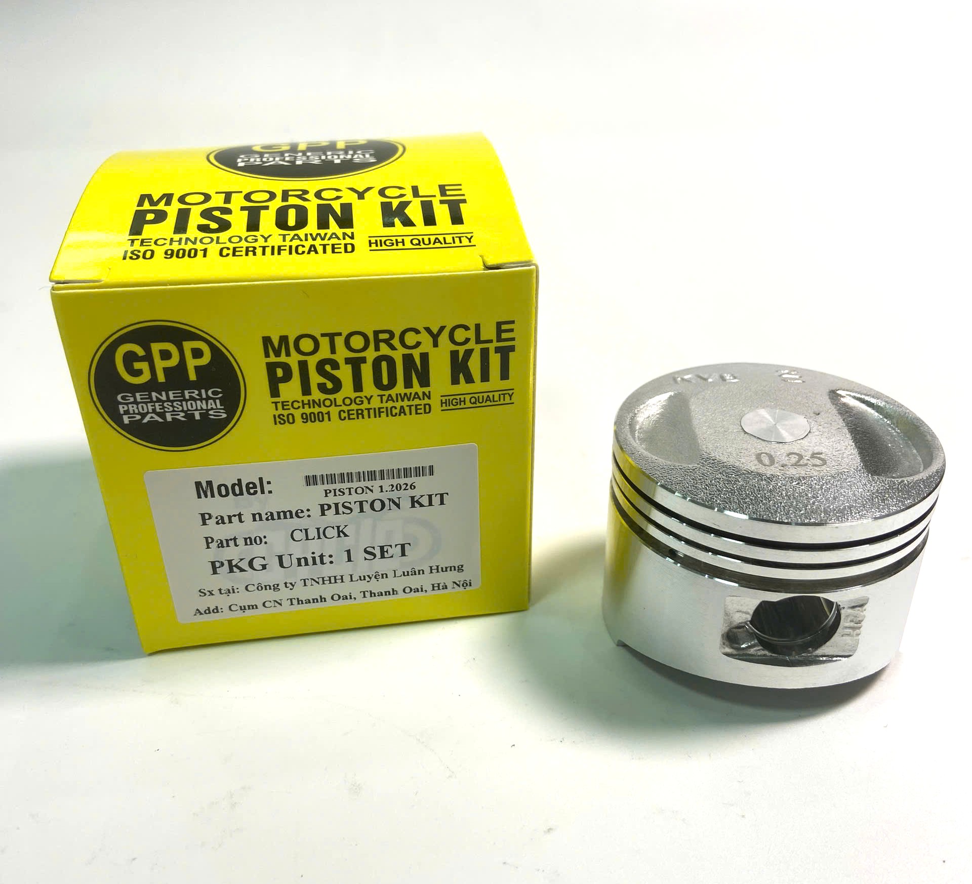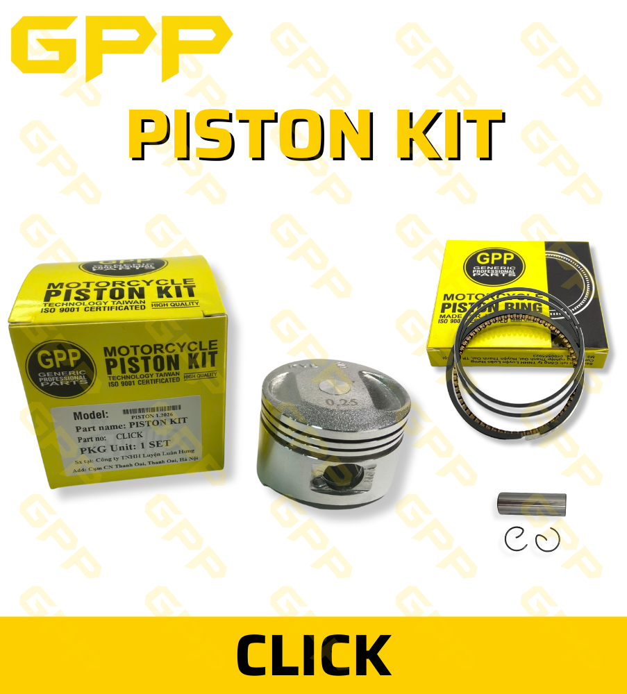 Bộ PISTON KIT HONDA CLICK thương hiệu GPP là phụ tùng thay thế cao cấp dành cho các dòng xe tay ga Honda Click 110, Click 125, Click Thái – giúp động cơ hoạt động mạnh mẽ, bốc máy tốt, êm ái và tiết kiệm nhiên liệu như mới.