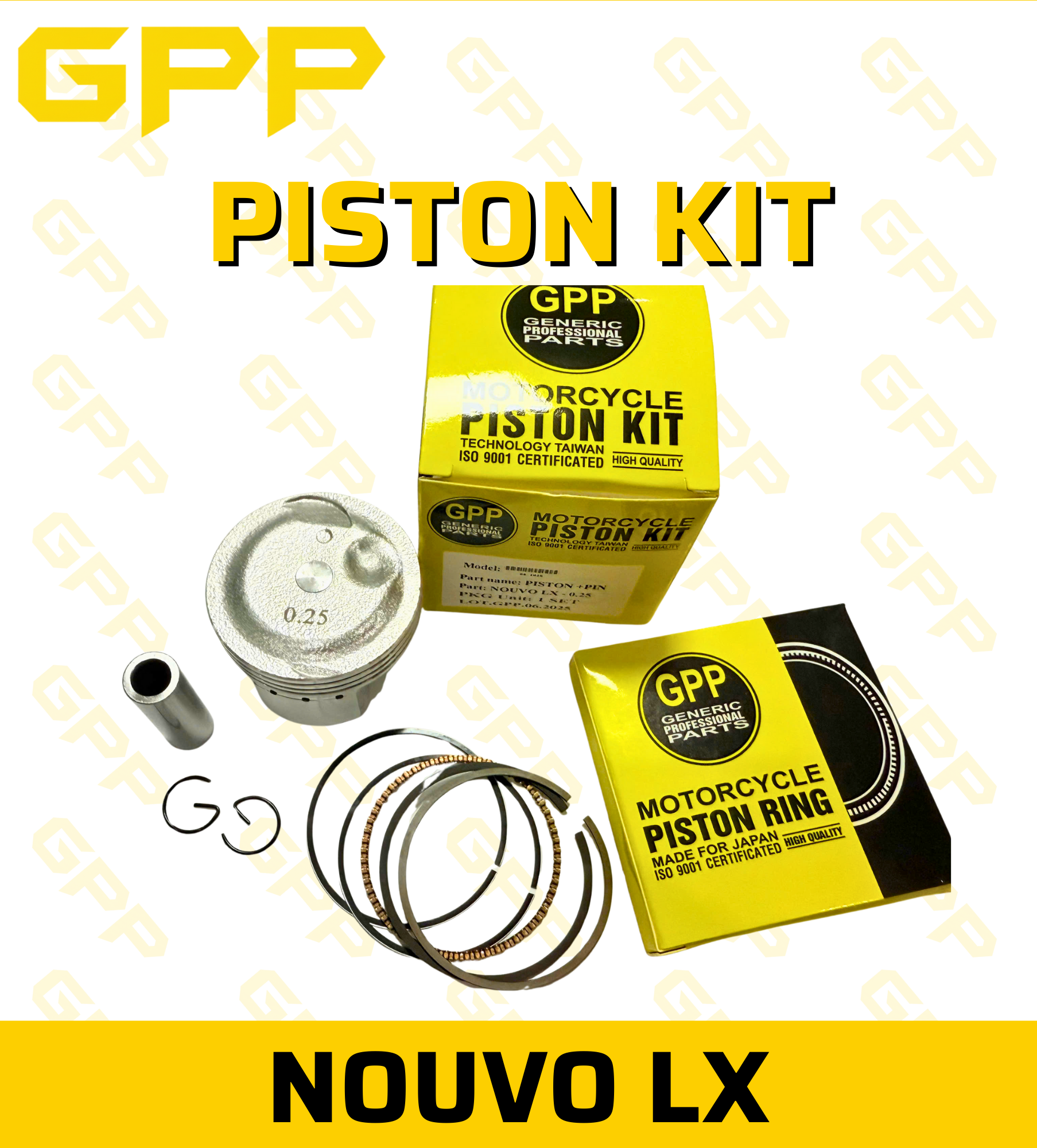Bộ PISTON KIT YAMAHA NOUVO (LX) thương hiệu GPP là phụ tùng thay thế cao cấp dành cho Yamaha Nouvo LX – giúp phục hồi lực nén, tăng công suất, vận hành mạnh mẽ, êm ái và tiết kiệm nhiên liệu như xe mới.